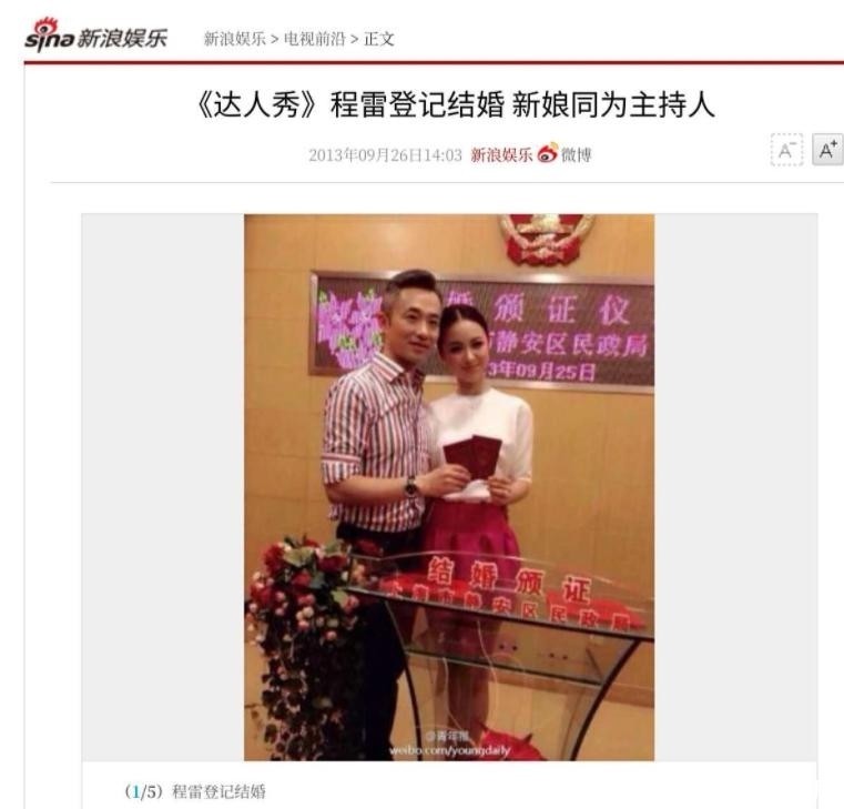 【2】新浪娱乐,2013-09-26,“《达人秀》程雷登记结婚,新娘同为主持人”.