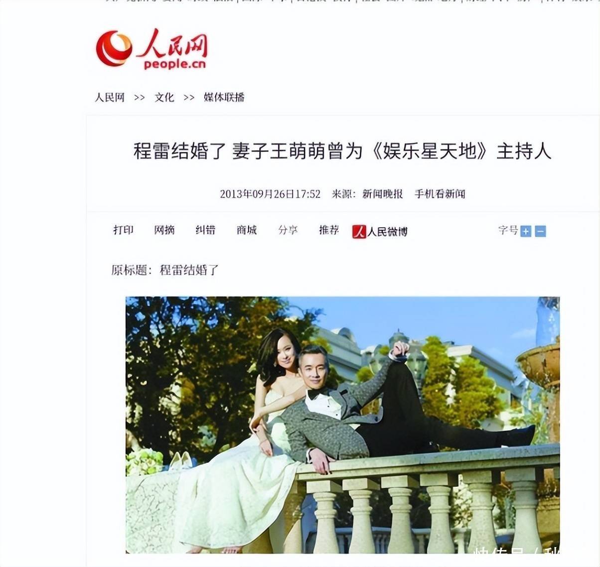 本文信息来源【1】人民网,2013-09-26,“程雷结婚了 妻子王萌萌曾为《娱乐星天地》主持人”.